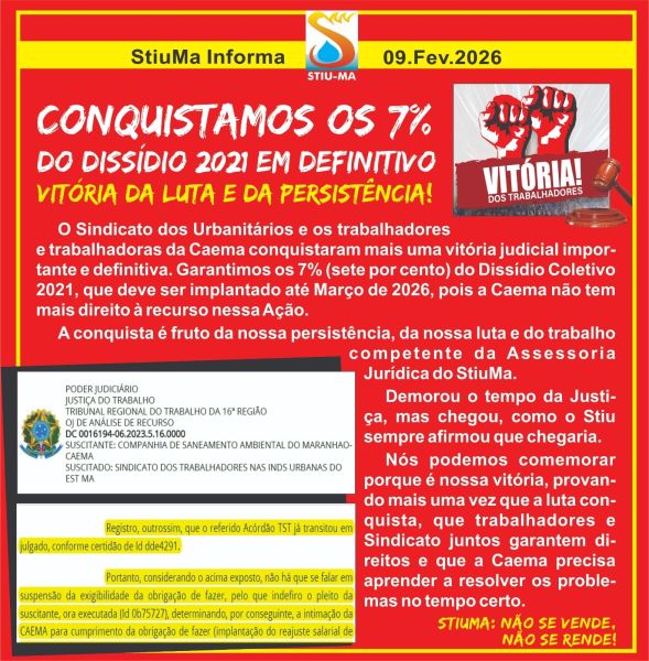 O Sindicato dos Urbanitários e os trabalhadores e trabalhadoras da Caema conquistaram mais uma vitória judicial importante e definitiva. Garantimos os 7% (sete por cento) do Dissídio Coletivo 2021, que deve ser implantado até Março de 2026, pois a Caema não tem mais direito à recurso nessa Ação.